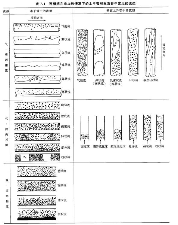 流型研究雖已有數十年的歷史,但流型分類(lèi)尚未統一,甚至同一名稱(chēng)的流型在定義上也不一致。下面根據氣—液、氣-固、液-固兩相流在非加熱情況下的水平管和垂直管中常見(jiàn)的流型列出表7. 1。