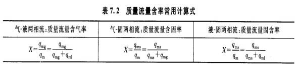 (1)質(zhì)量流量含率X為分相質(zhì)量流量(氣相質(zhì)量流量qmg、固相質(zhì)量流量qms、液相質(zhì)量流量qml)與兩相混合物總質(zhì)量流量qmn之比,常用計算式見(jiàn)表7.2。