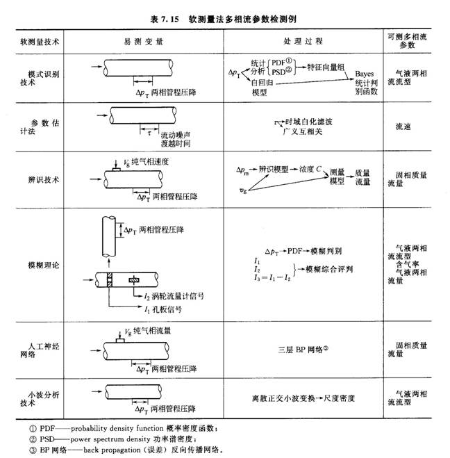 軟測量模型是基于軟測量技術(shù)建立的。常用的軟測量技術(shù)有狀態(tài)估計、過(guò)程參數辨識、人工神經(jīng)網(wǎng)絡(luò )、模式識別等。目前已應用于多相流參數檢測的實(shí)例見(jiàn)表7.15。