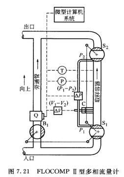 AGAR公司的MPFM-301型多相流量計構成如圖7.14所示,由氣-液兩相流量計和含水分析儀兩部分組成。氣—液兩相流量計可用于測量從泡狀流至塞狀流所有流態(tài)中的氣體流量qg和液體流量ql,其調節比等于25:1。它由兩種流量傳感器FS(1)和FS(2)構成。這兩種傳感器可以是任何形式的體積流量計和動(dòng)量?jì)x表。該公司為其開(kāi)發(fā)的復雜模型將各流量傳感器的輸出與氣液的總流量相聯(lián)系,同時(shí)還考慮了黏度、速度滑移比等。開(kāi)發(fā)出的模型形式為